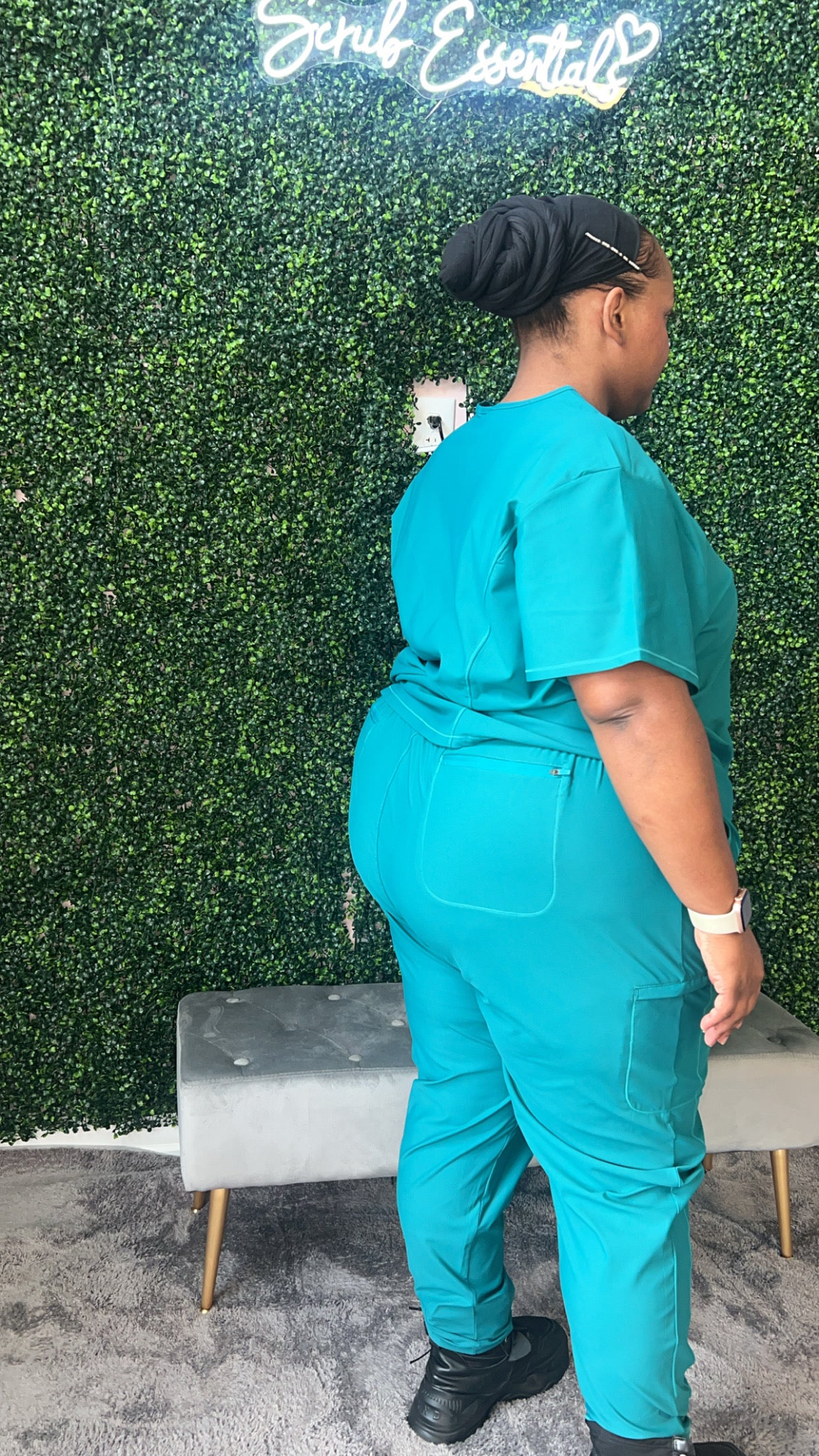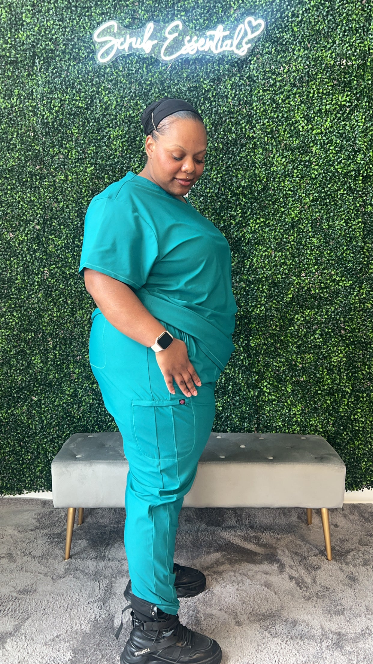 Ultra stretch. 86% polyester 14% spandex. One pocket on top. Pockets on side bottom scrub and two back pockets. Light weight and super soft. Can size down due to extreme stretch.