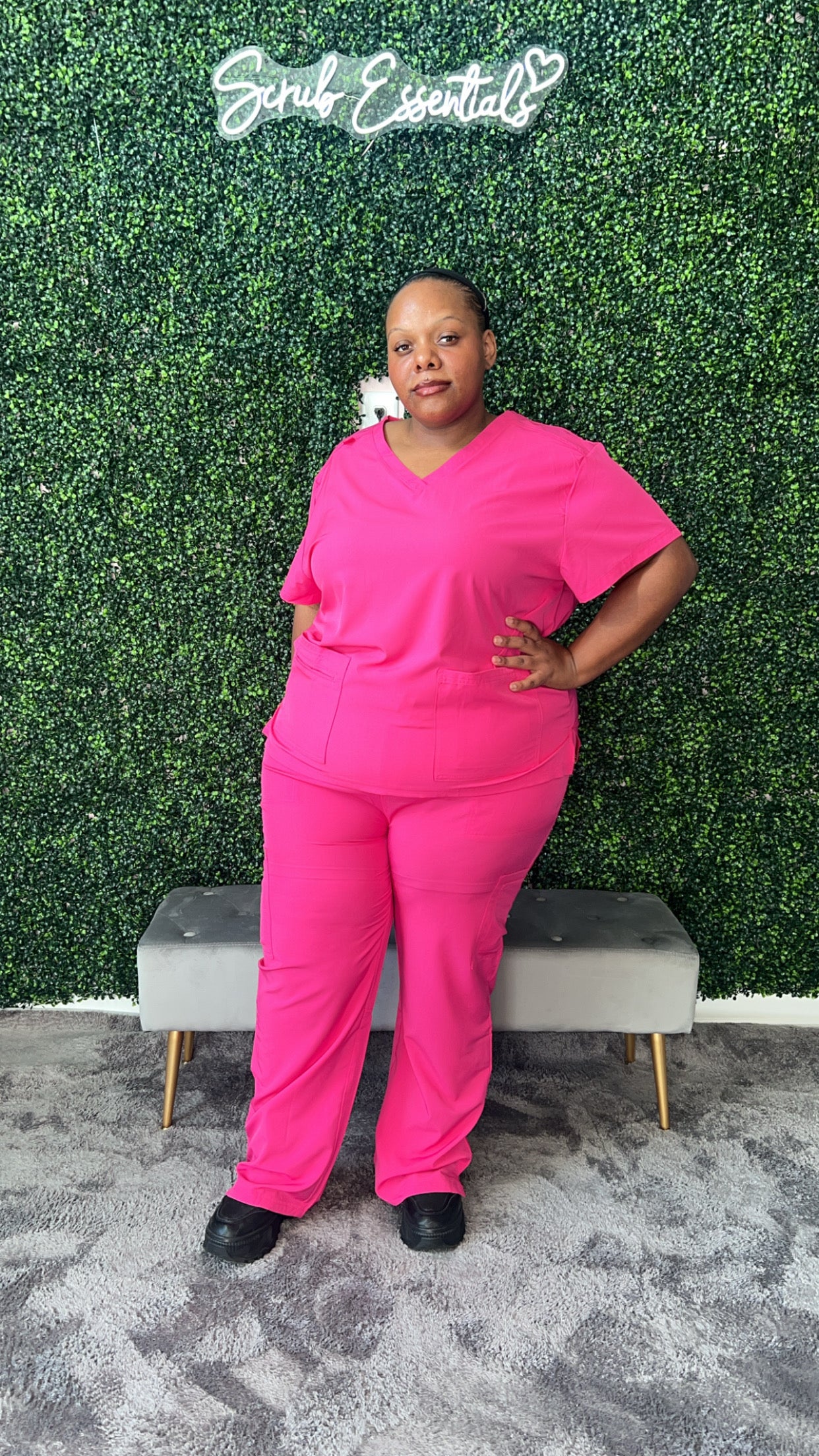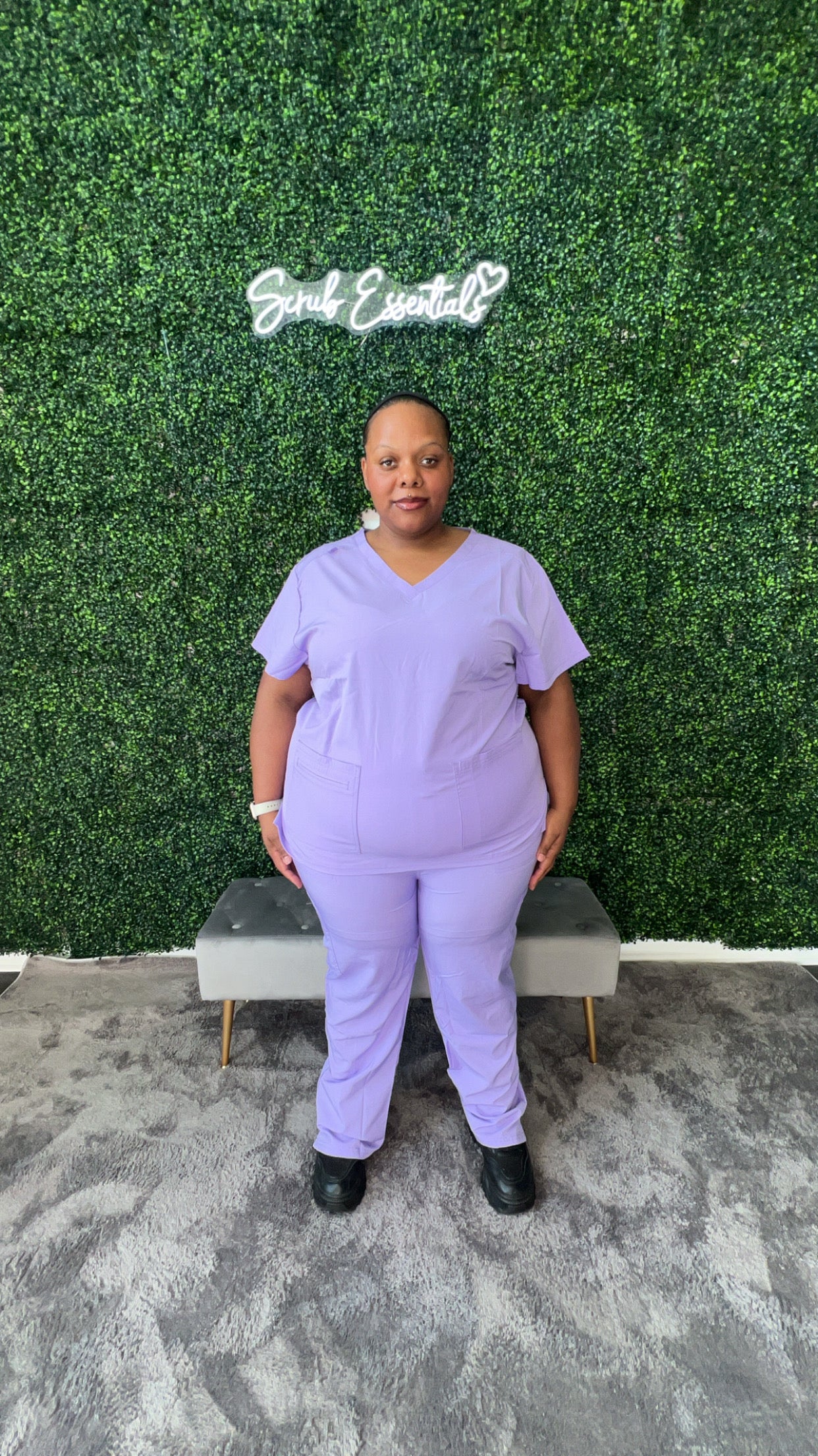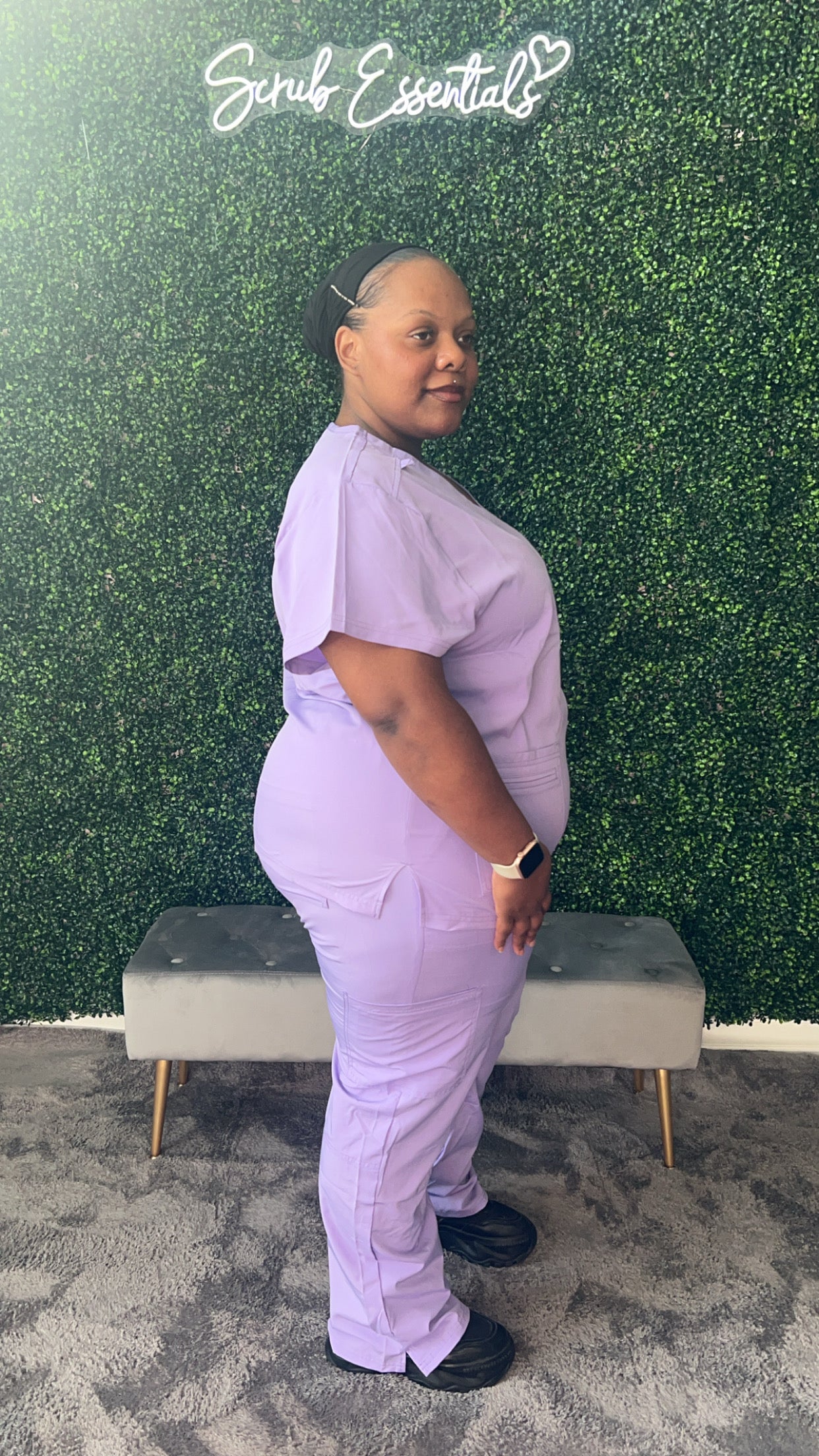 Premium stretch lavender colored scrub set. Plenty of pockets (8) moisture wicking and quick drying. 93% polyester 7% spandex. Sizes 3X available only