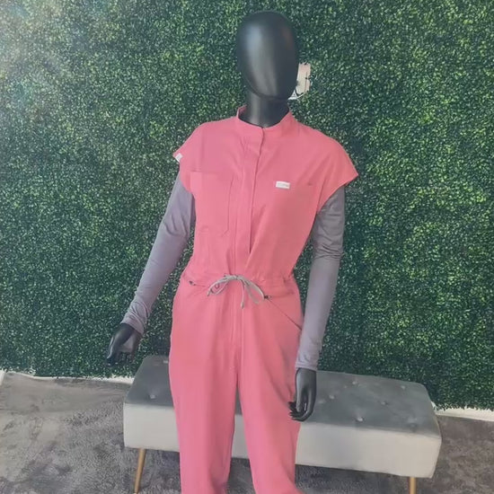 Our sleeveless jumpsuit jogger is sure to have heads turning throughout your area of practice. This suit has 8 pockets! Two chest pockets, two zippered patch pockets, two side seam pockets and two back pockets. Elastic ankle cuffs. Good stretch. Material: Polyester72%, Rayon22%, Spandex6%