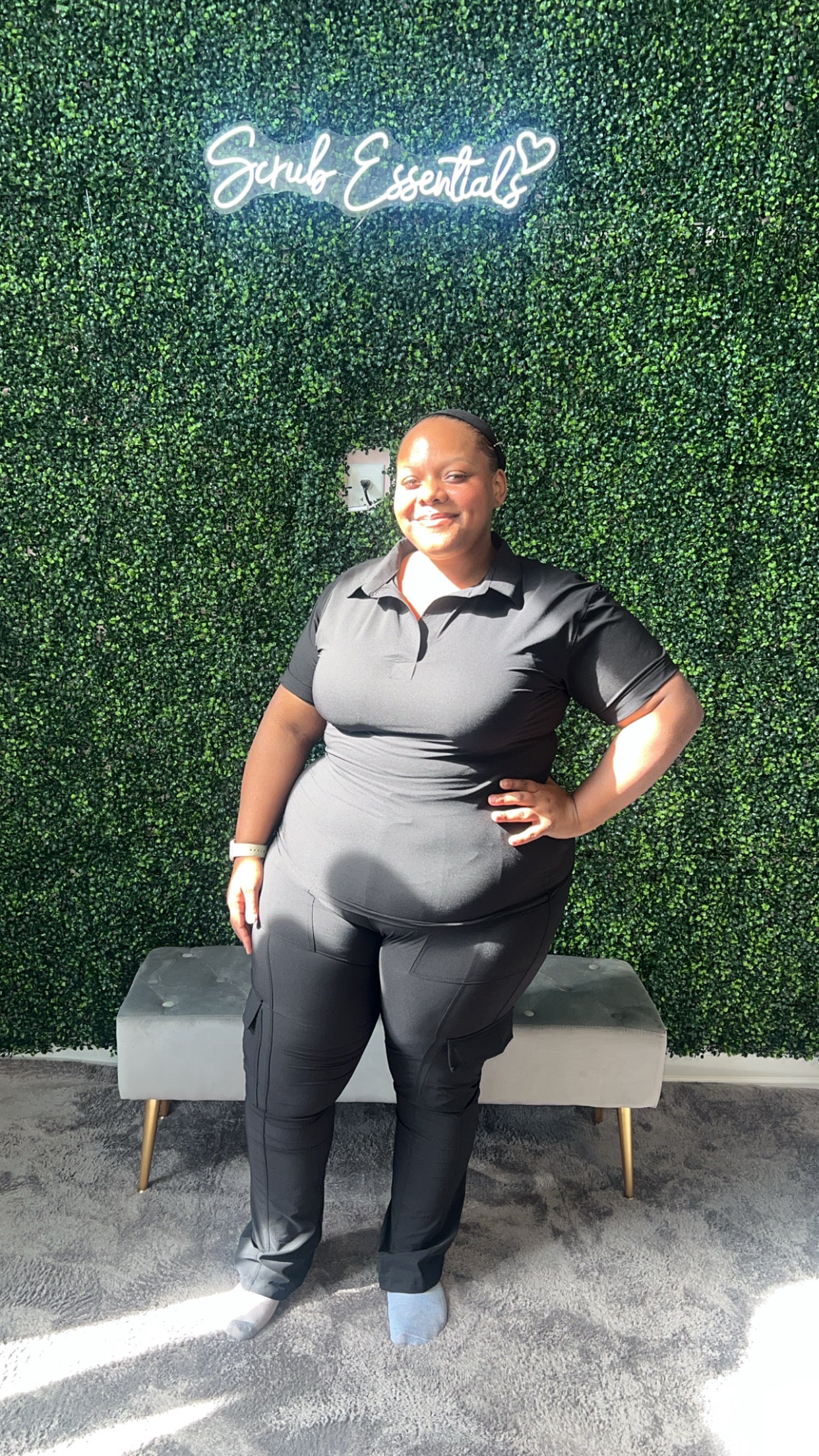 Super soft and stretchy, fast drying. This material is 180 GSM and 14% spandex 86% polyester. Stiched round pockets and cargo pockets on both sides of the scrub bottoms. So stretchy that you can go down a size. Model is wearing a 2X.